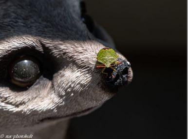 Sie ist eine versierte Fotografin. Mit diesem Bild hatte sie es leicht, weil sie nur auf die Wanze achten musste. Das Erdmännchen steht die ganze Coronoa-Zeit schon unbeweglich auf der Terrasse.